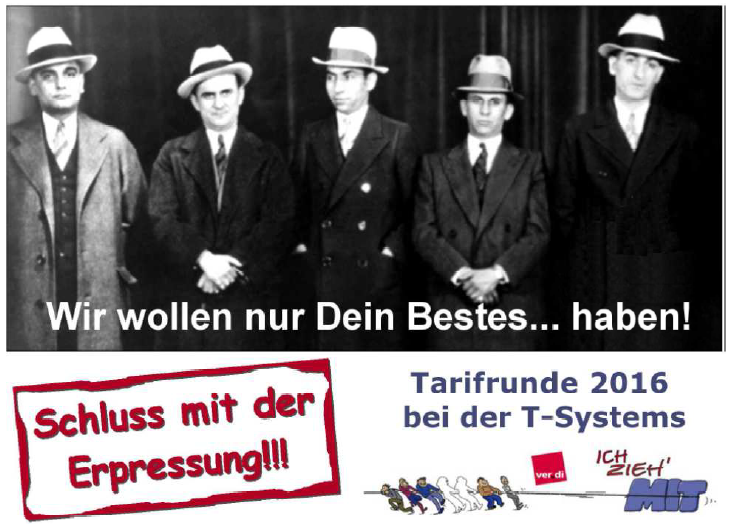 In der vierten Verhandlungsetappe der laufenden Tarifrunde 2016 für die T-Systems Unternehmen legten die Arbeitgeber ein provokantes „Angebot“ vor. Details dazu im angehängten Tarifinfo.